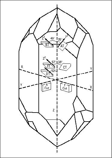晶片的切割可分為AT-CUT, BT-CUT, CT-CUT, DT-CUT, FT-CUT, XT-CUT, YT-CUT,如圖所示.它是以光軸(Z軸)為參考而命名,每種切法對應一個角度.采用何種切法應根據(jù)實際情況而定,如對溫度特性要求較好則應采用AT-CUT,如果對晶振要求的頻率較高時則采用BT-CUT.晶片的切割方式、幾何形狀、尺寸等決定了晶振的頻率.