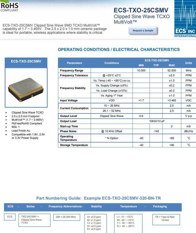 ECS-TXO-25CSMV MultiVolt™ 削波正弦波緊密??穩(wěn)定性TCXO溫補晶振允許客戶在多種設(shè)計中使用相同的設(shè)備。