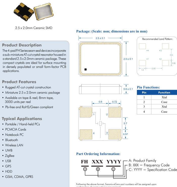 4-pad FH系列接縫密封裝置微型AT-cut石英晶體諧振器標準2.5 x 2.0mm陶瓷封裝。這些致密晶體是表面安裝的理想選擇在人口密集或小形狀因素PCB應用程序。
