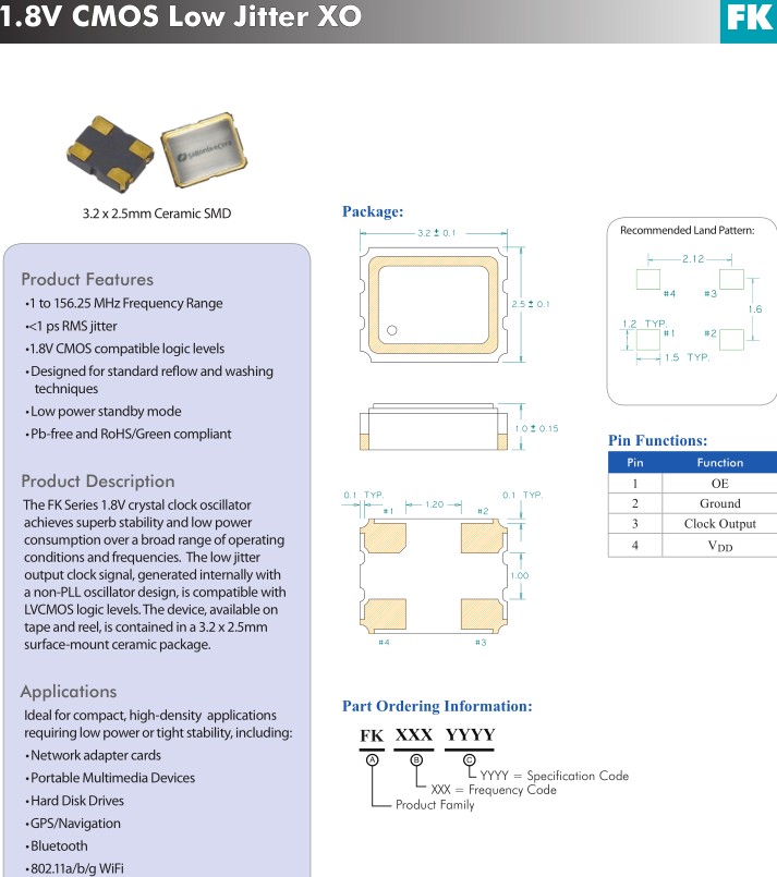 FK系列1.8V晶體時鐘振蕩器實現卓越的穩定性和低功率消費范圍廣泛,經營范圍廣條件和頻率。低抖動輸出時鐘信號,內部產生一個非鎖相環振蕩器設計,是兼容的LVCMOS邏輯水平。該設備,可在磁帶和卷軸,包含在3.2 x 2.5mm陶瓷表面包。