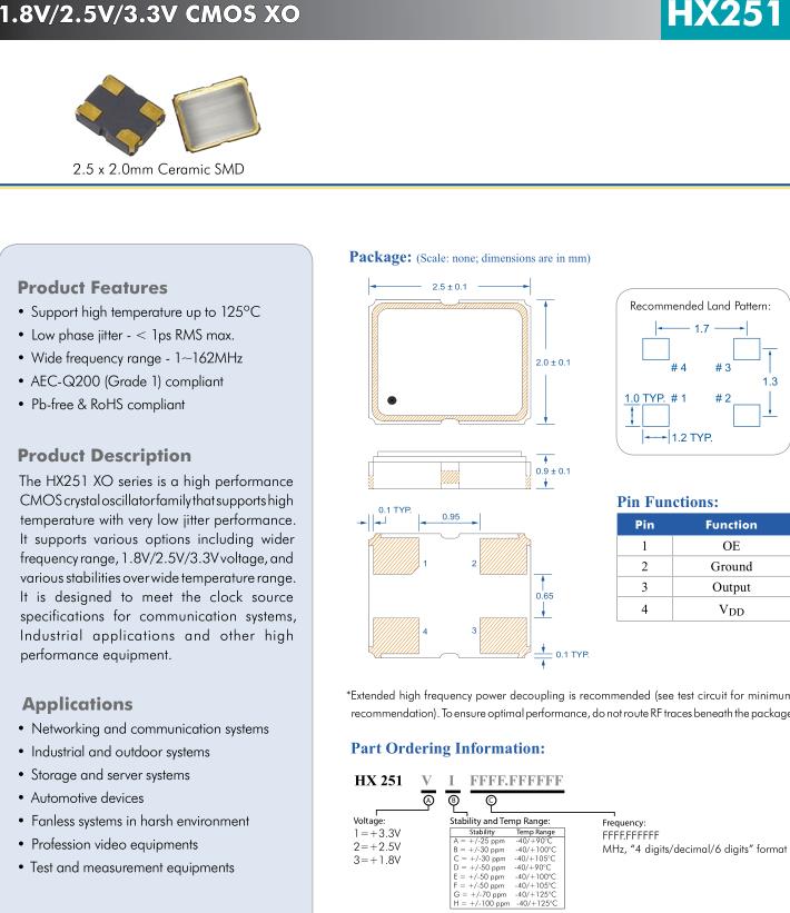 HX251 XO系列是高性能的CMOS晶體振蕩器家族,支持高具有極低抖動性能的溫度。它支持各種選項,包括更廣泛頻率范圍,1.8V/2.5V/3.3V電壓,和在較寬的溫度范圍內具有多種穩定性。它是為滿足時鐘源而設計的通信系統規范,工業應用等較高設備性能。