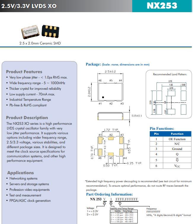 | NX252 | LVPECL | 3.32.5 | 5 到 1000 | <1 | 2.5x2.0x0.9 | 6 | 2.5mmx2.0mm LVPECL 可編程 XO | |