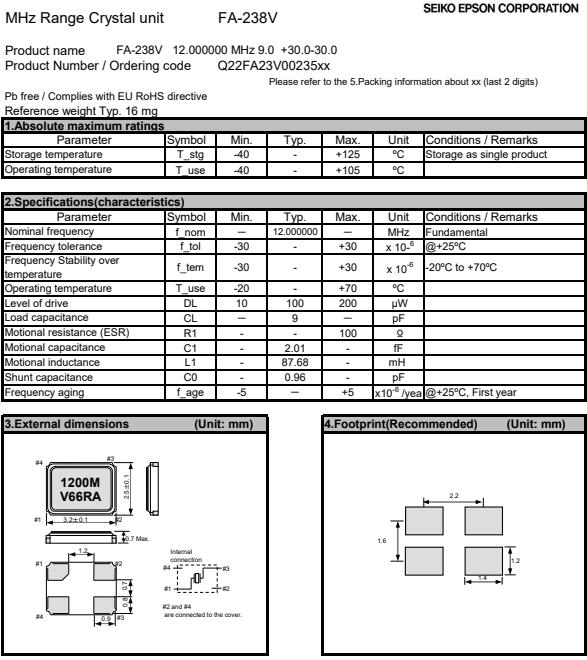 | Q22FA23V0035800 | 3.2 x 2.5 x 0.7mm | FA-238V | 12.000000 MHz | 7 pF | +/-30 ppm | +/-20 ppm | -20 to +70 °C |