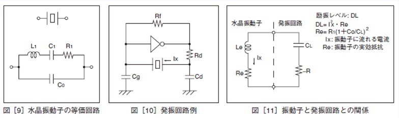水晶振動子の勵振レベルは、振動子の動作狀態における(消費)電力または、電流のレベルで表示されます(図[9]、 [10]、[11]參照)。過大な電力で振動子を動作させますと、周波數の不安定などの特性の劣化を生じたり、水晶片 の破壊を招く恐れがあります。ご使用にあたっては、絶対最大勵振レベルを超えない範囲で回路設計をしてください。