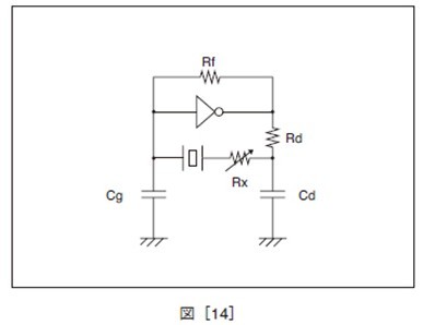 発振余裕度評価方法の例 振動子と直列に純抵抗Rx を付加し、発振の開始 (停止)を確認します。Rx の値を徐々に大きくし、 発振が開始(停止)する最大抵抗Rx に振動子の 実効抵抗Re を加えたものをその回路の概略の 負性抵抗とします。