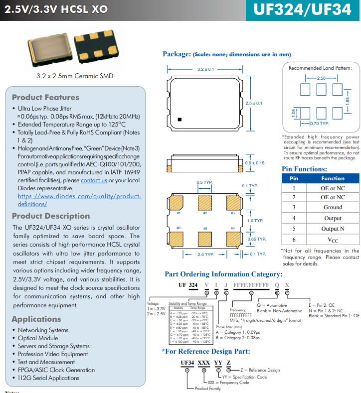 UF324/UF34 XO系列是經過優化的晶體振蕩器系列,可節省電路板空間。UF324/34系列,小體積尺寸3.2x2.5mm、超低抖動HCLS晶體振蕩器,該系列由具有超低抖動性能的高性能HCSL晶體振蕩器組成,可滿足嚴格的芯片組要求。它支持多種選擇,包括更寬的頻率范圍、2.5V/3.3V電壓和各種穩定性。它旨在滿足通信系統和其他高性能設備的時鐘源規范。