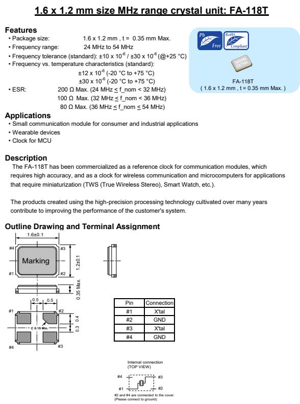 | X1E000251012600 | 1.6 x 1.2 x 0.35mm | FA-118T | 24.000000 MHz | 7 pF | +/-30 ppm |