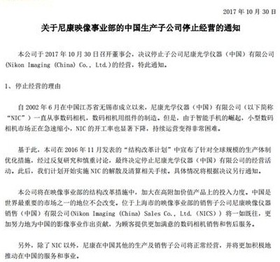 10月30號,尼康召開董事會,決定停止子公司無錫市尼康光學儀器(中國)的經營。 尼康光學儀器2002年6月在江蘇無錫成立,一直從事數碼相機、數碼相機用組件的制造。關于停止經營的理由,尼康在停止經營的通知中這樣表示:由于智能手機的崛起,小型數碼相機市場正在急速縮小,NIC的開工率也顯著下降,持續經營變得非常困難。除了尼康光學儀器有限公司之外,尼康在中國其他的子公司以及生產線都將正常運行尼康關閉這家公司后,將集中精力生產單反相機等高附加值產品。