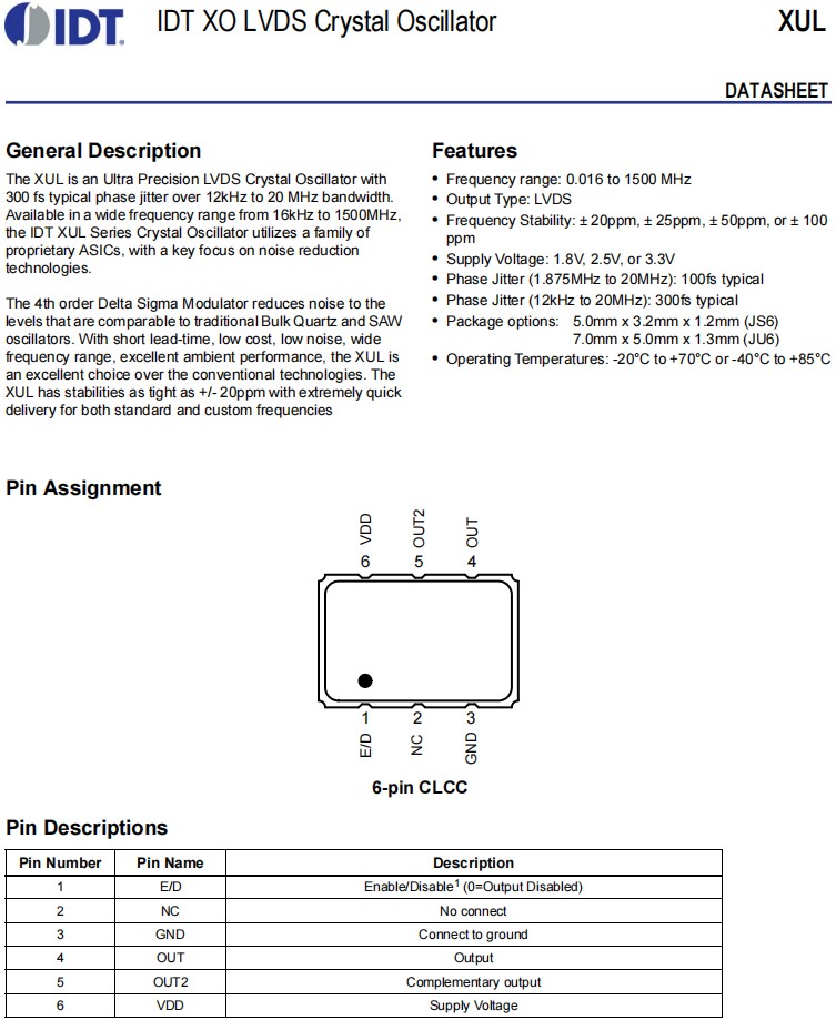 IDT石英晶體振蕩器,XUL535125.000JS6I8,6G通訊設(shè)備晶振,XUL736150.000JU6I,LVDS差分晶振,參數(shù)表