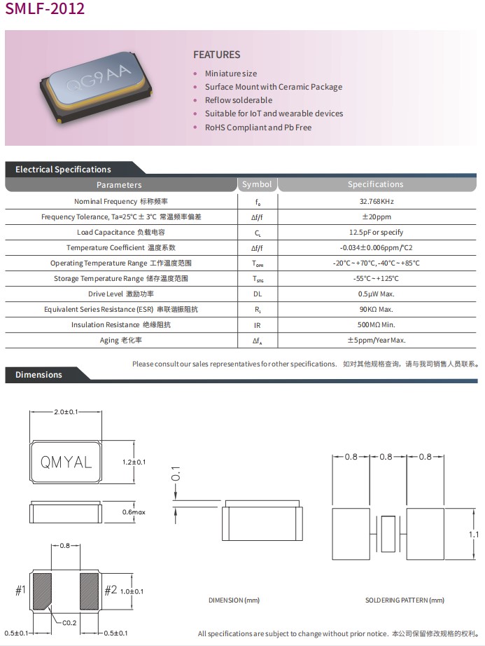 SMLF-2012,Interquip無源晶振,鐘表電子晶振,6G無線晶振,32.768K貼片晶振,可穿戴設備晶振,參數表