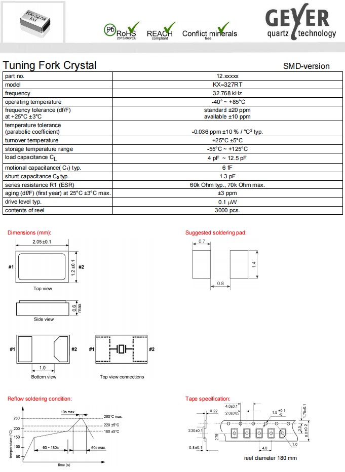 Geyer格耶晶振KX-327RT系列音叉晶體(2.0x1.2x0.6毫米),兩腳貼片晶振,石英晶體諧振器,無源晶振,石英晶振,頻率為32.768kHz,負載電容7pF,工作溫度范圍:40° ~ +85°C,具有超小型,輕薄型,耐熱及耐環境特點,用于優化電路瞬態響應和低功耗,特別適合用于可穿戴設備,智能手機,智能手表,手環,平板電腦,鐘表電子,儀器儀表,智能門鎖,智能水電表,無線藍牙,計時產品等應用。6G無線晶振KX-327RT是可穿戴設備應用的理想選擇