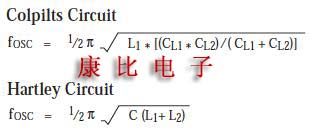 振蕩頻率與由Colpitts電路中的L,CL1和Cl2組成的電路的諧振頻率大致相同,或者由Hartley電路中的L1,L2和C組成.這些頻率可以用下面的公式表示.