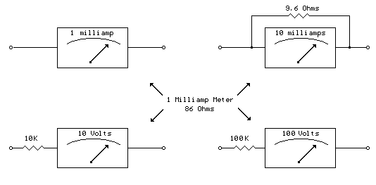 通過增加串聯(lián)電阻,毫安表可用作電壓表.所需的電阻是滿量程電壓讀數(shù)除以儀表運動的滿量程電流.因此,如果你有一個1毫安表并且你想讀0-10伏,你將需要10/.001=10K歐姆的總電阻.儀表運動本身將具有較小的阻力,這將是總10K阻力的一部分,但通常低到足以忽略.以下示例中的電表具有86歐姆的電阻,因此所需的真實電阻值為10K-86或9914歐姆.但使用10K標準值將在1%以內(nèi),因此我們可以忽略86歐姆.對于1伏的滿量程讀數(shù),儀表電阻將更加重要,因為它將占所需總電壓的8%左右,因此您可能需要使用914歐姆電阻,或910標準值.毫安表還可用于通過增加并聯(lián)電阻來測量更高的電流.電表電阻現(xiàn)在變得非常顯著,因為要將范圍增加十倍,我們需要通過并聯(lián)電阻繞過總電流的9/10.因此,要將1毫安表轉(zhuǎn)換為10毫安表,我們需要一個86/9=9.56歐姆的并聯(lián)電阻.