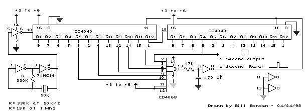 使用50Khz晶體時,當加起來50000的相應計數(shù)器位全部為高時,檢測到50000的計數(shù).這對應于位15(32768)+14(16384)+9(512)+8(256)+6(64)+4(16).位14和15是第二計數(shù)器的第3和第4級,位0是第一計數(shù)器(Q1,引腳9)的第一級.要使用100Khz晶體,每個位將向右移動一次,因此總數(shù)將為(65536+32768+1024+512+128+32=100,000).使用1Mhz晶體,需要以下位: 在1Mhz時,有源晶振電路中的330K電阻需要按比例減小到大約15K.當達到終端計數(shù)時,施密特觸發(fā)器反相器級在NAND門之后產(chǎn)生7μS復位脈沖.47K電阻和470皮法電容維持輸出,使計數(shù)器可靠地復位為零.這在50Khz時不到一個時鐘周期,并且不會引入錯誤,但在1MHz時將達到7個周期,這將導致計數(shù)器每秒丟失7微秒的時間.這不是一個錯誤(百萬分之七),但它會存在.4040CMOS計數(shù)器的最小復位脈沖寬度約為1.5uS,因此復位脈沖不能短得多.