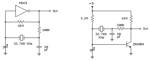 下面是幾個電路,您可以使用這些電路從普通的手表水晶產(chǎn)生32.768KHz的方波.輸出可以饋送到15級二進制計數(shù)器以獲得1秒方波.建議在晶體管電路上使用4069逆變器左側(cè)的電路,以產(chǎn)生更好的波形.單晶體管電路產(chǎn)生更多的斜坡波形,但輸出擺動整個電源電壓范圍,因此它很容易將輸入驅(qū)動到CMOS二進制計數(shù)器.