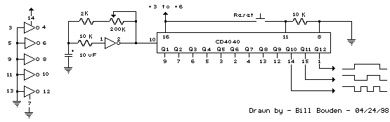 在12級二進制計數(shù)器(CD4040)的每個連續(xù)級處將頻率除以2,在最終級(Q12)切換到高狀態(tài)之前產(chǎn)生大約1小時的時間.通過調(diào)整振蕩器頻率或使用不同的RC值可以獲得更長或更短的時間.當前級切換到低狀態(tài)(0伏)時,每個連續(xù)級改變狀態(tài),因此每級的頻率是之前級的頻率的一半.最后3個階段顯示波形圖.要開始延遲周期,可以通過暫時將復位線(引腳11)連接到正電源來將計數(shù)器復位為零.時序精度不如石英晶體振蕩器好,并且可能只有1或2%左右,具體取決于振蕩器電容的穩(wěn)定性. 電話環(huán)發(fā)生器使用開關電源