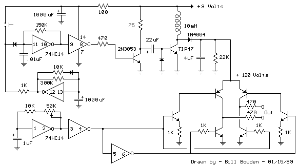 下面所示的電話環(huán)發(fā)生器從簡單的開關模式電源(SMPS)產(chǎn)生所需的高電壓,該電源采用CMOS施密特觸發(fā)器方波振蕩器,10mH電感器,高壓開關晶體管(TIP47或其他高電壓,1安培晶體管)和驅(qū)動石英晶振管(2N3053).電感應具有1.5歐姆或更低的低直流電阻.開關電源必須連接負載以防止電壓上升過高,因此在輸出端使用22K電阻,將電壓限制在120DC左右,電話振鈴器斷開,直流電壓約為90V.可以通過改變引腳10和11之間的150K電阻值來調(diào)節(jié)輸出電壓,這將改變振蕩器頻率(頻率大約為800Hz,如圖所示).通過第二個施密特觸發(fā)器振蕩器(引腳12/13)接通和斷開電源,使電話振鈴約2秒鐘,然后電路在振鈴之間空閑約一分鐘.這些時間可通過連接到引腳12的10K和300K電阻進行調(diào)整.所示的按鈕用于手動振鈴電話.25Hz振鈴頻率由另一個控制H橋晶體管輸出電路的施密特觸發(fā)器振蕩器(引腳1/2)產(chǎn)生.輸出級中的6個晶體管(4個NPN,2個PNP)應為額定電壓為200伏特或更高的高壓類型.振鈴器僅消耗10mA左右,因此輸出晶體管可以具有低額定電流但必須具有高額定電壓.我使用了手頭上的TIP47s和未知數(shù)字的小信號PNP,但其他類型如NTE287(NPN)和NTE288(PNP)應該有效.兩者都有300伏的CE評級,郵購機構(gòu)的成本約為0.95美元.