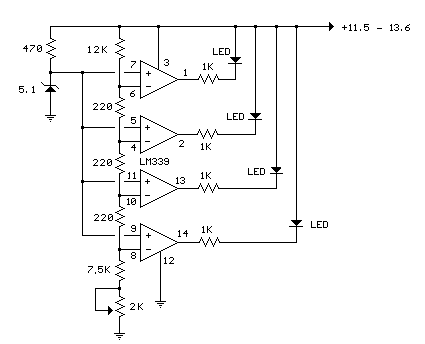 在下面的電路中,四電壓比較器(LM339)用作簡單的條形圖表,用于指示12伏鉛酸電池的充電狀況.5伏參考電壓連接到四個比較器的每個(+)輸入,(-)輸入連接到沿分壓器的連續(xù)點.當負(-)輸入電壓超過參考電壓時,LED將亮起.校準可以通過調(diào)節(jié)2K電位器來完成,這樣當電池電壓為12.7伏時,所有四個LED都會亮起,表示電池沒有負載就完全充電.在11.7伏特時,LED應該熄滅,表示電池耗盡.每個LED表示充電狀態(tài)變化約為25%或300毫伏,因此3個LED表示75%,2個LED表示50%等.