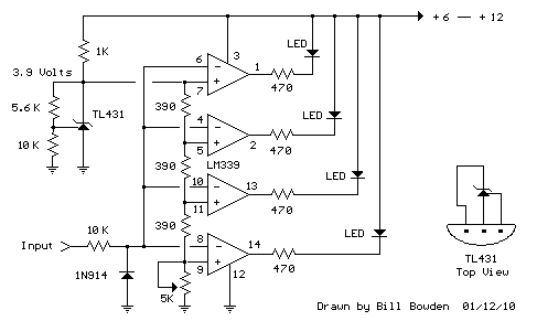 這是與上述類似的電路,并提供了一個4LED條形圖,顯示了常見的3.6伏鋰離子可轉(zhuǎn)換手機電池的電壓.參考電壓由TL431可編程電壓源提供,該電壓源設置為3.9伏,TL431連接到1K電阻.引腳14處LED的下部參考電壓由5K可調(diào)電阻設置.