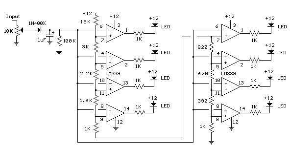 下面的電路使用兩個四路電壓比較器(LM339)來照亮一系列指示音量的8個LED.8個比較器中的每一個都被分壓器設定的增加的電壓偏置,以便當輸入在8歐姆系統(tǒng)中輸入大約400毫伏或大約22毫瓦峰值時,右下LED首先亮起.設置分壓器電壓,使每個LED的功率水平大約是前一個LED的兩倍,因此當所有LED點亮時,水垢從22毫瓦延伸到大約2.5瓦.輸入控制可以降低靈敏度以讀取更高的水平.我沒有制作或測試過這個電路,所以如果你在使用它時遇到問題,請告訴我.功率水平應如下: