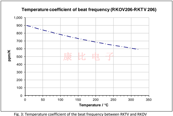 如果參考晶體RKOV206與傳感器晶體RKOV206結合使用,兩個晶體成對使用,頻率差約為550Hz@25.如果兩個晶振處于相同的溫度下,RKOV206和RKOV206之間產生的頻率差(拍頻)如圖2所示(綠色虛線).拍頻的溫度系數如圖3所示.它比僅RKTV頻率的溫度系數(25°C)高15倍. 實際應用