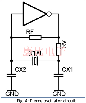 這兩種石英晶振可以在合適的振蕩器電路中單獨工作.有兩個推薦電路,一個是帶有一個邏輯反相器門的"Pierce"振蕩器,另一個是使用兩個串聯邏輯反相器的"Heegner"電路.