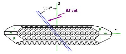 在各種不同種類的切割角度方式中,“1XSE038400AR”, AT角度切割的石英芯片適用在數MHz到數佰MHz的頻率范圍,是石英芯片應用范圍最廣范及使用數量最多的一種切割應用方式. 在(圖五)中, 從石英晶棒X-軸向的上視圖, 可以看到對Z-軸向旋轉約35度的AT 方向. 這在大量生產的技術上也是很好達成的一種作業方式.