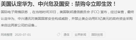 美國政府每年有84.98億美元的通用服務(wù)基金被用于補(bǔ)貼美國的寬帶部署和服務(wù).2019年11月,美國聯(lián)邦通信委員會官網(wǎng)刊發(fā)一份一致投票,以5比0的投票結(jié)果發(fā)布了這一聲明:禁止華為和中興的設(shè)備出現(xiàn)在FCC的通用服務(wù)基金資助項目中的文件,華為,中興的網(wǎng)絡(luò)設(shè)備在美國被 限制,相當(dāng)于少了這款銷售點,當(dāng)?shù)匾采倭酥虚g賺其的費(fèi)用,兩大公司受到限制,不單單是網(wǎng)絡(luò)設(shè)備售賣不出去,手機(jī)內(nèi)的元器件,石英晶振,溫補(bǔ)振蕩器,電池,手機(jī)殼也是為用武之地.FCC主席Ajit Pai周二的聲明中說:網(wǎng)絡(luò)安全就是國家安全,今日行動將有助于保護(hù)我們的網(wǎng)絡(luò)免受來自華為和中興設(shè)備的新威脅,我們不能也不會允許中國利用網(wǎng)絡(luò)漏洞并危及我們的關(guān)鍵通信基礎(chǔ)設(shè)施.
