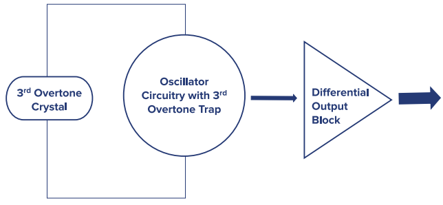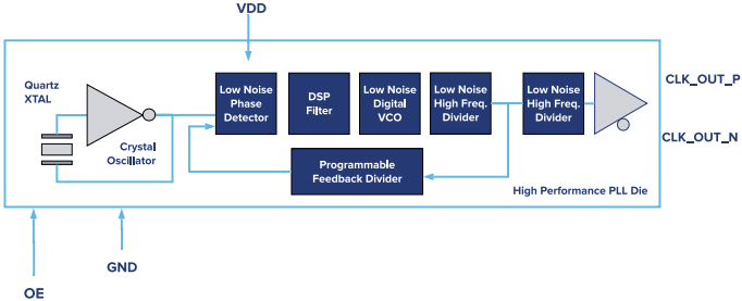 AX3性能的秘密在于它的簡單性.仔細設計第三泛音晶體毛坯,并適當捕獲所需載波信號,確保目標載波具有出色的均方根抖動性能.如圖2所示,AX3架構不采用典型的鎖相環方法,因此沒有"上變頻"簡單地說,所產生的信號沒有分數或整數乘法,因此,最終輸出頻率與第三泛音石英晶體的諧振頻率具有一對一的相關性.不采用小數乘法簡化了設計,并在3.2x2.5x1.0mm小型封裝中提供了最佳抖動.
