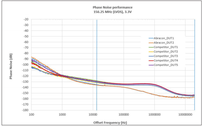 不是我 認為,競爭對手的解決方案基于倒置臺面晶體技術,不采用AX3家族的第三泛音晶體架構.此外,競爭對手設備內部的有源電路顯示出偏離載波10千赫至1千赫之間的大約-135分貝/赫的閾值.這一限制有助于降低目標帶寬(12千赫至20兆赫)上的均方根抖動性能.