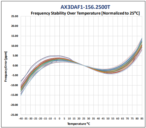 圖4:AX3在-20℃至+70℃時的穩定性為15ppm,在-40℃至+85℃時的穩定性為25ppm