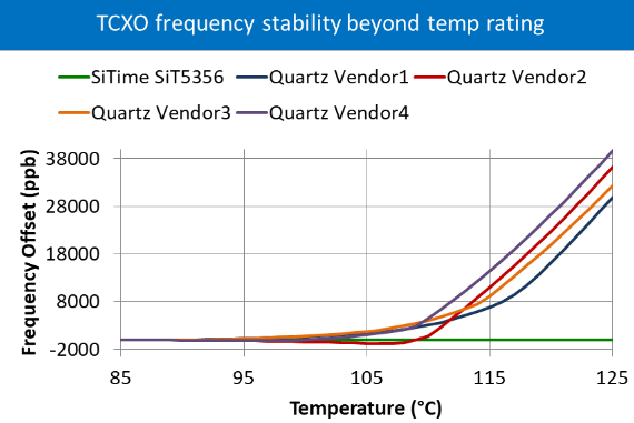 上圖顯示了五個工業級TCXO器件在+85°C至+125°C的頻率穩定性.基于MEMS的SiT5356 Elite Platform™Super-TCXO幾乎沒有降級.相比之下,石英晶振TCXO的穩定性降低到數萬ppb范圍.
