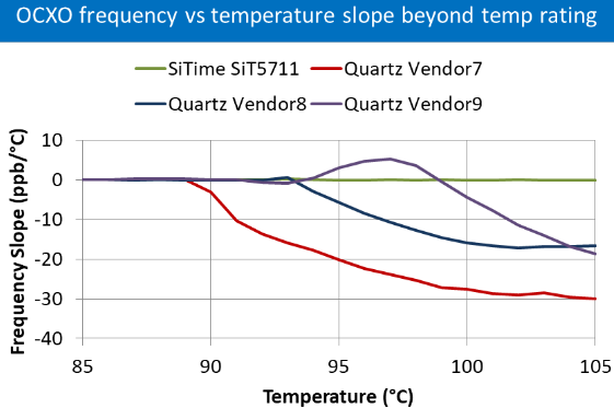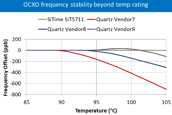 我們在測試OCXO晶振設備時會看到類似的行為,如下圖所示.在這里,我們比較了四個工業級OCXO器件的性能,從+85°C到+125°C.石英器件的穩定性在溫度超過額定溫度范圍后開始降低,而基于MEMS的SiT5711EmeraldPlatform™OCXO可保持穩定性.