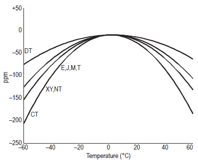 未補(bǔ)償AT切割晶體的公差可從-10°C至60°C降低至5PM,更寬的溫度范圍需要更大的公差,如圖3所示,顯示了一系列典型的AT切割頻率-溫度曲線.這些曲線可以用三次方程來表示,并且強(qiáng)烈依賴于石英貼片晶振坯料的切割角度.零溫度系數(shù)的點(diǎn)稱為上下轉(zhuǎn)折點(diǎn).通過選擇切割角度,可以在需要的地方放置一個(gè)轉(zhuǎn)折點(diǎn);另一個(gè)是固定的,因?yàn)閮烧叨缄P(guān)于20-30°C范圍內(nèi)的一點(diǎn)對(duì)稱.轉(zhuǎn)折點(diǎn)之間的斜率隨著它們一起移動(dòng)而變小.設(shè)計(jì)用于烤箱的晶體被切割,使得上轉(zhuǎn)折點(diǎn)與烤箱工作溫度一致.圖4顯示了幾次低頻切割的頻率溫度曲線.J形切口使用頻率低于10kHz,而XY形切口可以使用頻率在3kHz至85kHz之間.NT切割可以在10kHz范圍內(nèi)使用.DT切割適用于100千赫至800千赫,CT切割適用于300千赫至900千赫. 負(fù)載電容