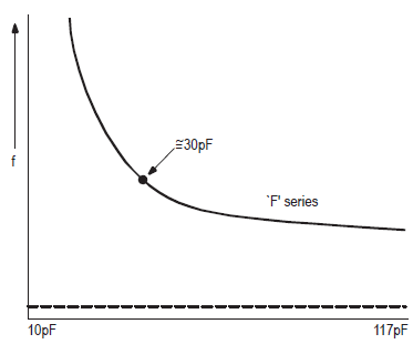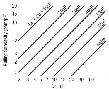 其中C1,C0和CL都用相同的單位表示.圖5顯示了頻率變化對(duì)負(fù)載電容變化的影響的典型曲線.或者,通常將晶體的可拉性表示為負(fù)載電容每pF變化的微調(diào)靈敏度,單位為ppm.這由以下單位以ppm/pF表示: