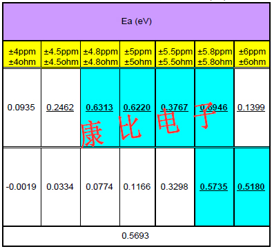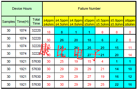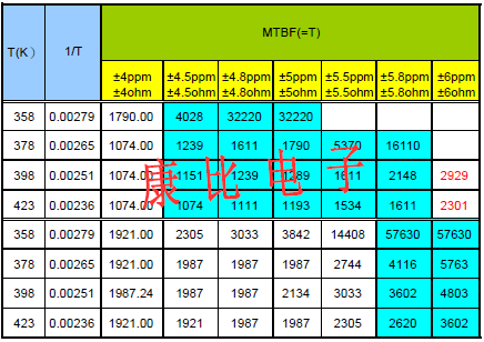 表4為高溫儲存的實驗設計,透過不同頻偏規格可計算出樣品的失效總數,但有效區塊的選擇必須滿足電子元器件的一般失效原則,方能視為有效的MTBF值.以表4為例±5ppm/±5?對應1921hrs的失效數,其失效不符合石英晶振電子元器件溫度愈高失效數愈多的原則,故不得作為Ea平均計算的依據.