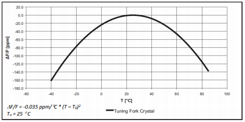 基于音叉型石英振子的32.768khz振蕩器的頻率穩(wěn)定性一般以表示室溫25℃下的常溫頻率偏差和共振頻率相對(duì)于溫度變化的拋物線特性的兩個(gè)參數(shù)來(lái)表示.頻率溫度特性可根據(jù)制造商數(shù)據(jù)表中的變化點(diǎn)溫度和2次溫度系數(shù)進(jìn)行計(jì)算.