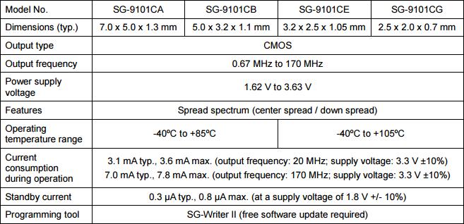 SG- 8101系列的振蕩器有大約66%收緊頻率公差和當(dāng)前消費(fèi)比同類產(chǎn)品低50%.SG- 9101系列振蕩器,它使用一個(gè)擴(kuò)展頻譜消耗比較數(shù)據(jù)目前低于75%.用戶將能夠項(xiàng)目產(chǎn)品所需的輸出頻率,以及所需的輸出頻率調(diào)制和周期. 這些振子可以在各種環(huán)境條件下使用.他們也將極大地有助于性能,降低電力需求,快速發(fā)展周期和小批量生產(chǎn).適用于:通訊設(shè)備、數(shù)碼科技、醫(yī)療設(shè)備、車載電子、智能穿戴設(shè)備、智能機(jī)器人、無人機(jī)以及高端的航空、軍事設(shè)備領(lǐng)域.