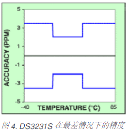 理想的精確計時器件是集成了RTC、TCXO和石英晶體的單芯片方案。DS3231S、 DS3232和即將公布的DS3234既是這樣的器件。這些器件具有無與倫比的精度:0°C到+40°C范圍內精度為±2.0ppm,相當于每年±1.0分鐘;-40°C到0°C和+40°C到+85°C范圍內為±3.5ppm,相當于每年±1.8分鐘。最差情況下所能提供的精度如圖4所示。如上所述,集成TCXO使晶體原有的拋物線特性曲線變成較為平坦的曲線。