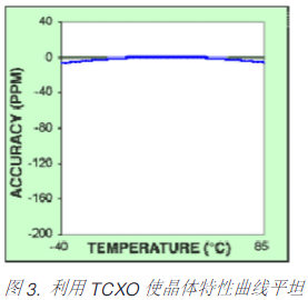 另一種有效提高計時精度的方法是使用具有溫度補償的32.768KHZ晶體振蕩器(TCXO),如DS32kHz,作為獨立的RTC時鐘源。這種器件經過工廠校準,在擴展工業(yè)級溫度范圍內(-40°C至+85°C)能夠提供±7.5ppm的精度。TCXO的作用是將晶體拋物線變得平坦(圖3)。